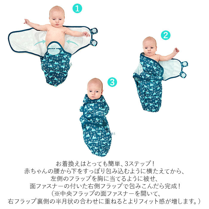 ・赤ちゃんの腰から下をすっぽり包み込むように横たえてから、左側のフラップを胸に当てるように被せ、面ファスナーの付いた右側フラップで包みこんだら完成!(※中央フラップの面ファスナーを開いて、右フラップ裏側の半月状の合わせに重ねるとよりフィット感が増します。)
