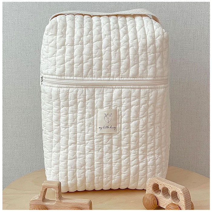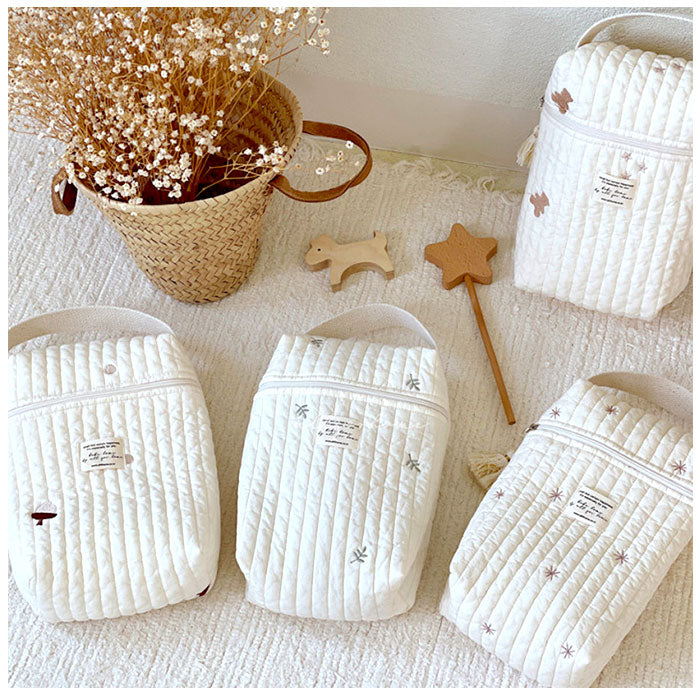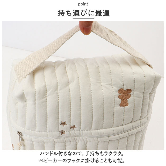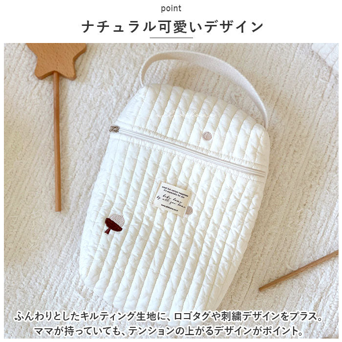 ・ふんわりとしたキルティング生地に、ロゴタグや刺繍デザインをプラス。ママが持っていても、テンションの上がるデザインがポイント。