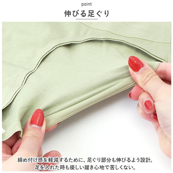 ・締め付け感を軽減するために、足ぐり部分も伸びるよう設計。足を入れた時も優しい履き心地で苦しくない。