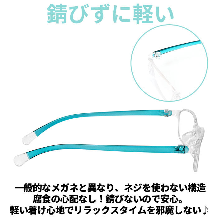 ・一般的なメガネと異なり、ネジを使わない構造なので、腐食の心配なし!錆びないので安心。