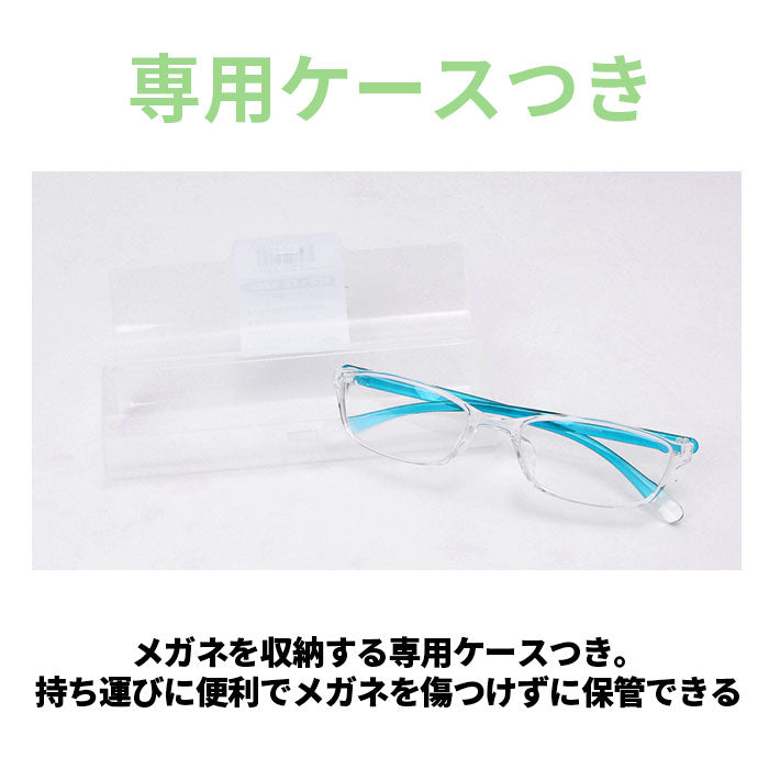 ・メガネを収納する専用ケースつき。持ち運びに便利でメガネを傷つけずに保管できる。