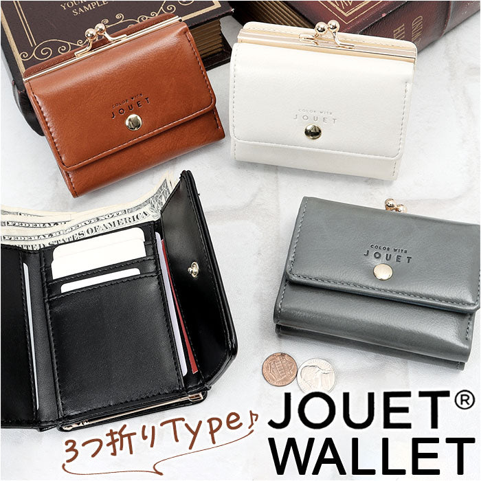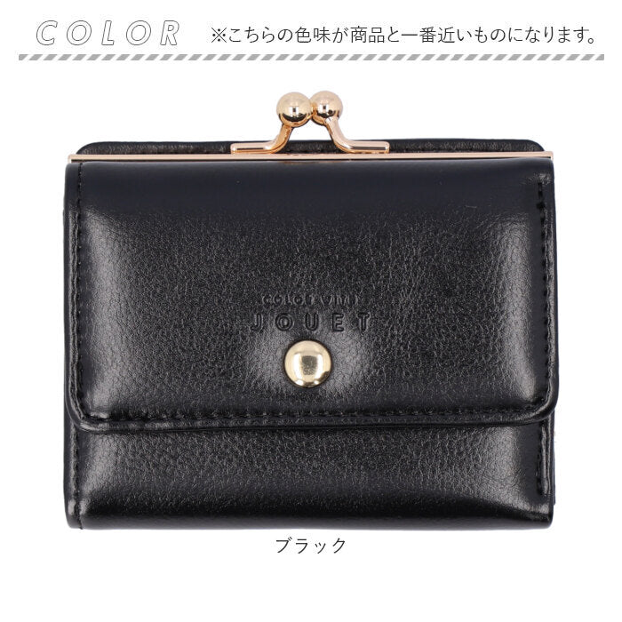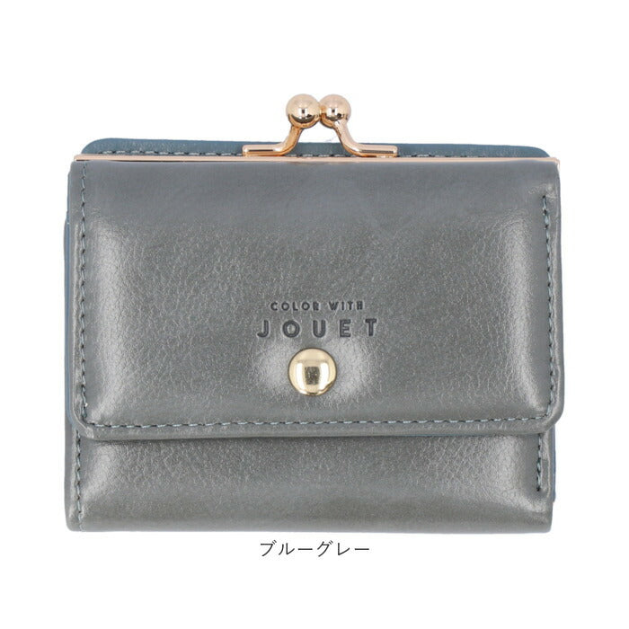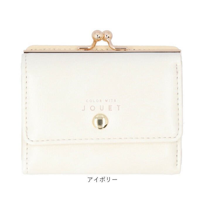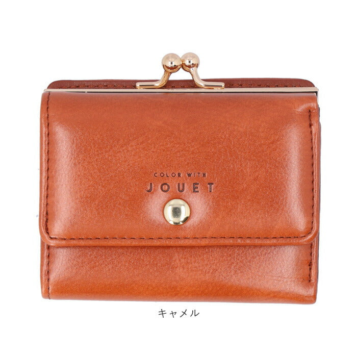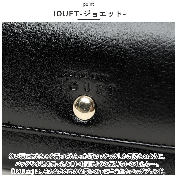 ・落ち着いたカラーリングのフェイクレザーに、ゴールド色のがま口金具やカシメがキラリと光る大人可愛いデザイン。「COLOR WITH JOUET」のエンボスロゴが控えめなワンポイント。