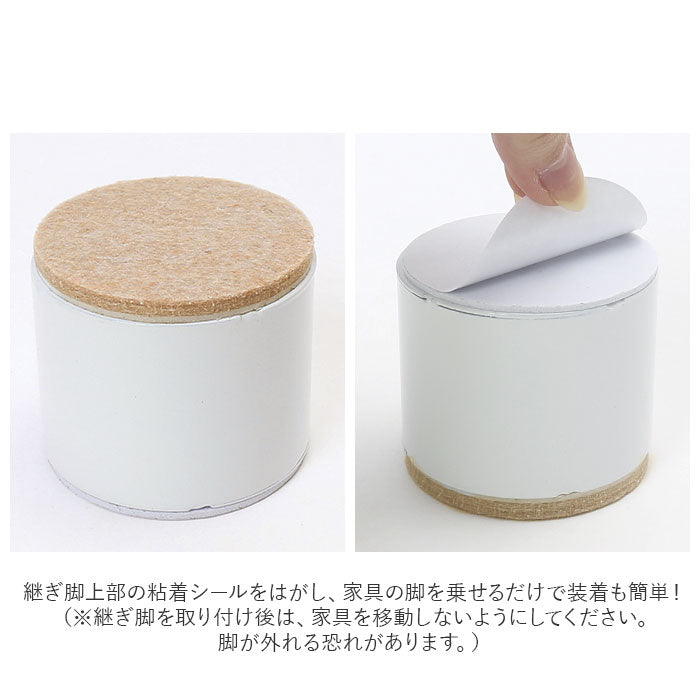 ・継ぎ脚上部の粘着シールをはがし、家具の脚を乗せるだけで装着も簡単!(※継ぎ脚を取り付け後は、家具を移動しないようにしてください。脚が外れる恐れがあります。)