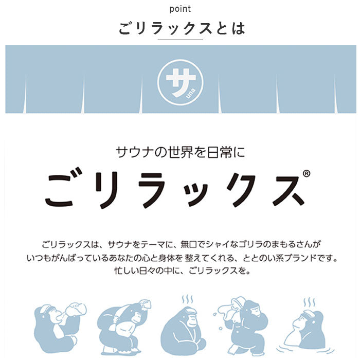 ・ごリラックスは、サウナをテーマに、無口でシャイなゴリラのまもるさんが、いつもがんばっているあなたの心と身体を整えてくれる、ととのい系ブランド。