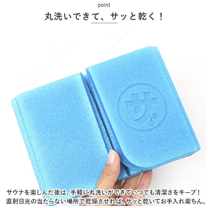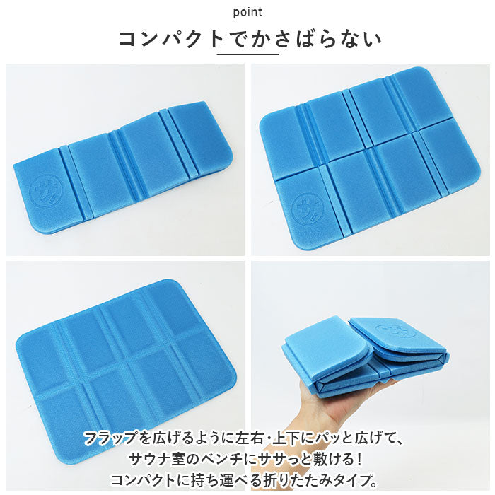 ・フラップを広げるように左右・上下にパッと広げて、サウナ室のベンチにササっと敷ける!コンパクトに持ち運べる折りたたみタイプ。