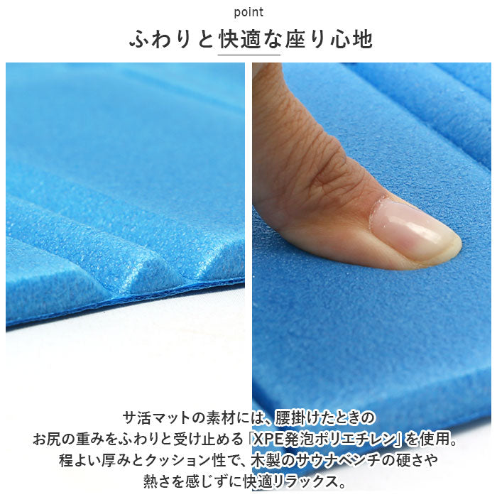 ・サ活マットの素材には、腰掛けたときのお尻の重みをふわりと受け止める「XPE発泡ポリエチレン」を使用。程よい厚みとクッション性で、木製のサウナベンチの硬さや熱さを感じずに快適リラックス。