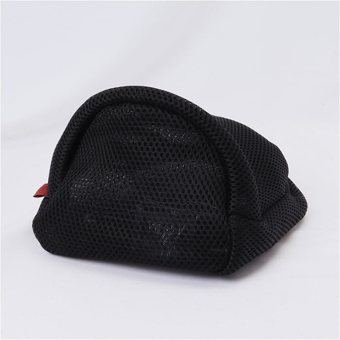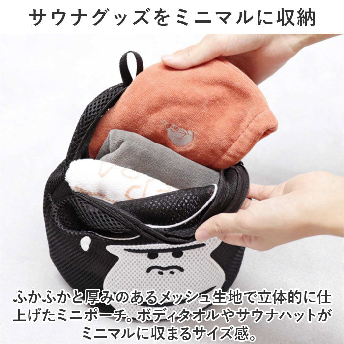 ・まもるさんのお顔をモチーフに、ふかふかと厚みのあるメッシュ生地で立体的に仕上げたミニポーチ。ボディタオルやサウナハットがミニマルに収まるサイズ感。