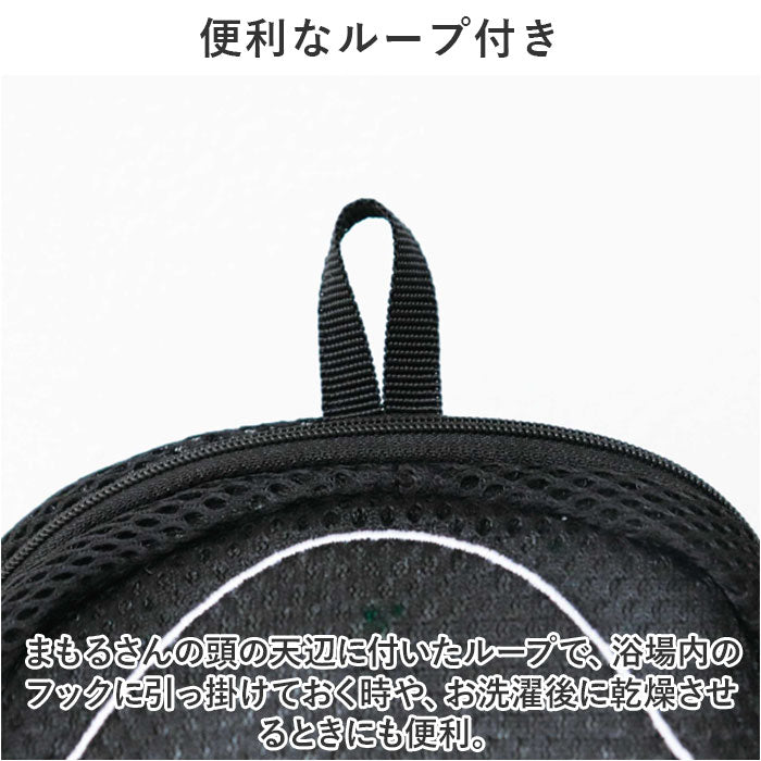 ・まもるさんの頭の天辺に付いたループで、浴場内のフックに引っ掛けておく時や、お洗濯後に乾燥させるときにも便利。