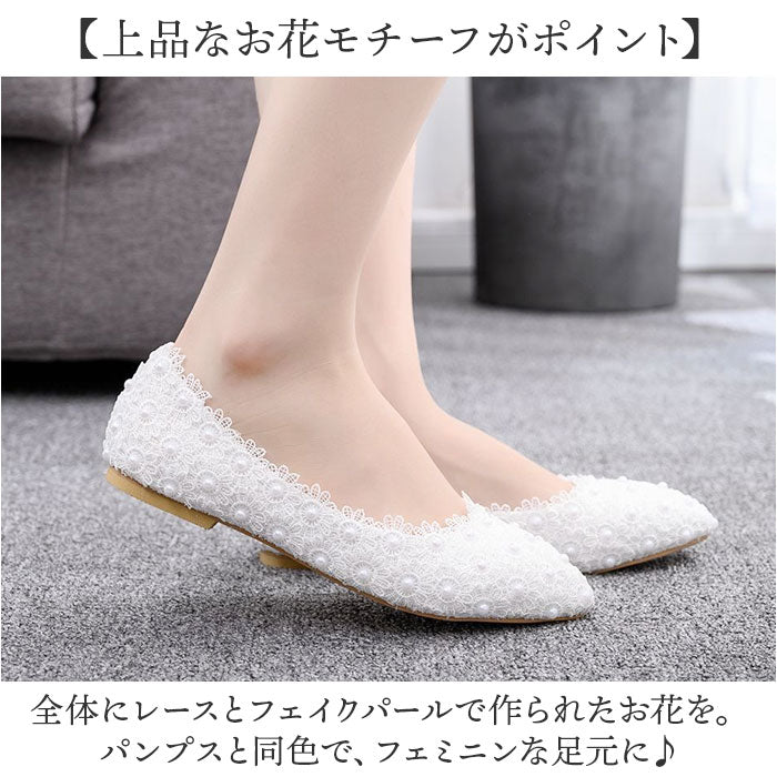・全体にレースとフェイクパールで作られたお花を。パンプスと同色で、フェミニンな足元に♪