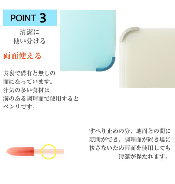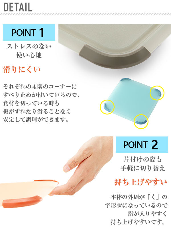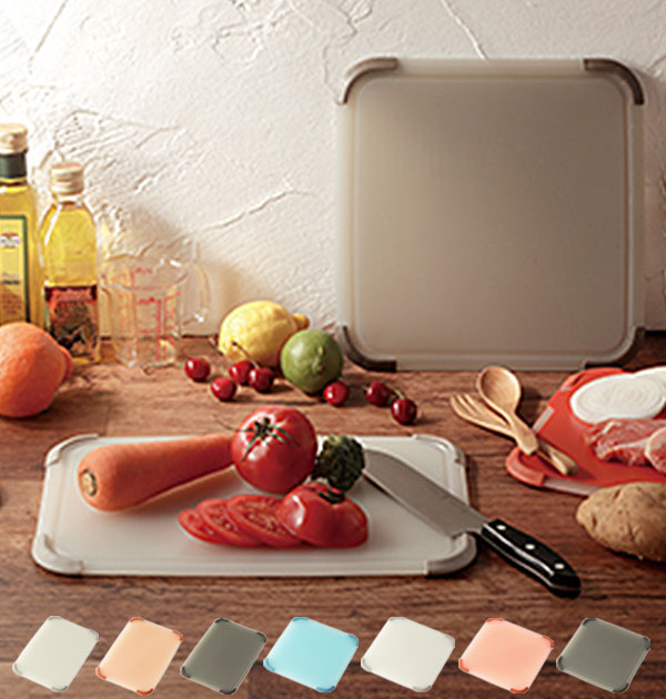 使いやすさを考えた滑らないカッティングボード(まな板)♪それぞれのコーナーにすべり止めが付いているので、食材を切っているときも滑らず安定して調理ができます。本体の外周が「く」の字形状になっているので、指が入りやすく、ストレスなく持ち上げることができます。両面とも使用可能。表裏で溝有り・溝無し面になっており、汁気の多い食材は溝のある調理面で使用すると便利です。無駄なく広い調理面で余裕をもってお料理が可能です。別売りのリベラリスタハングシートを組み合わせると更に便利に使えます。