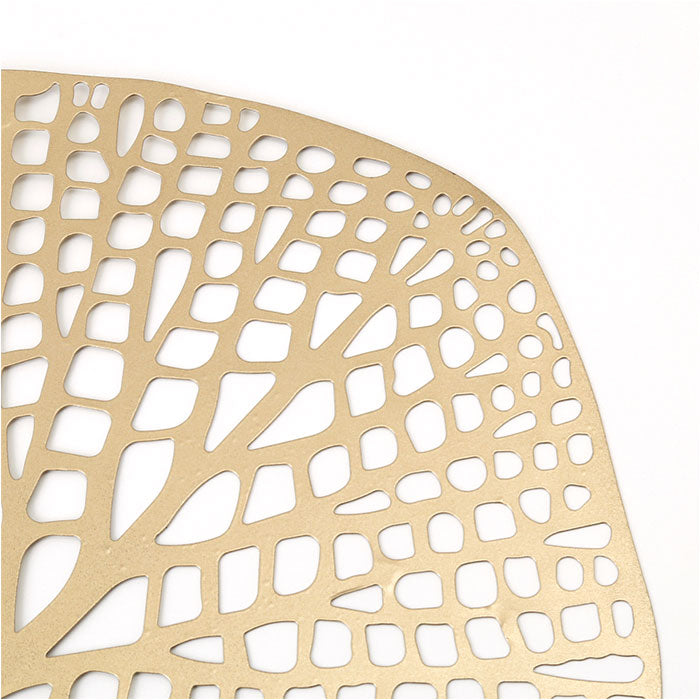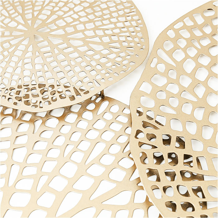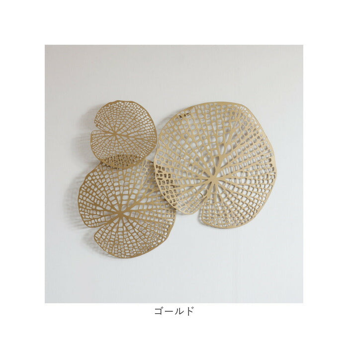 ・大きさの異なる蓮の葉が3枚重なった、葉脈を強調した透かし葉のようなデザイン。
