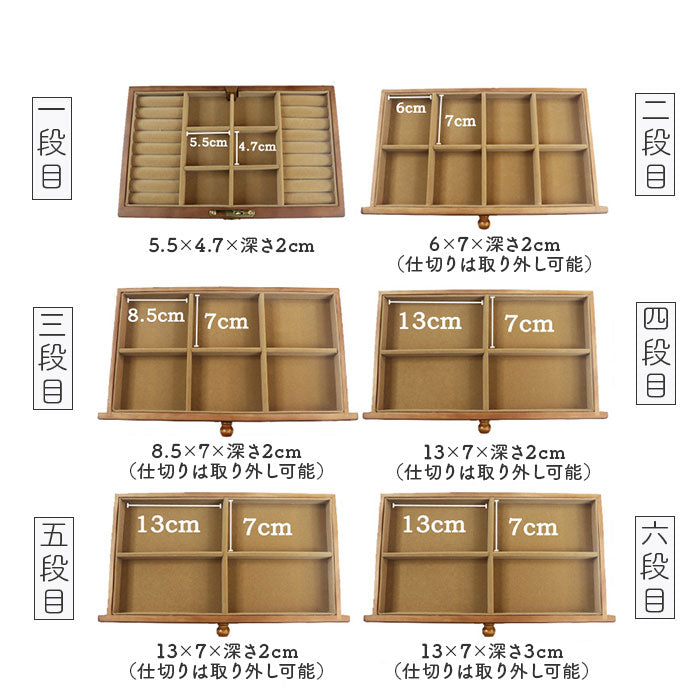 ・1段目:ネックレス収納フック×6(下部にポケット付き)、リングスロット×16、フリースペース×6