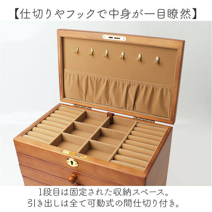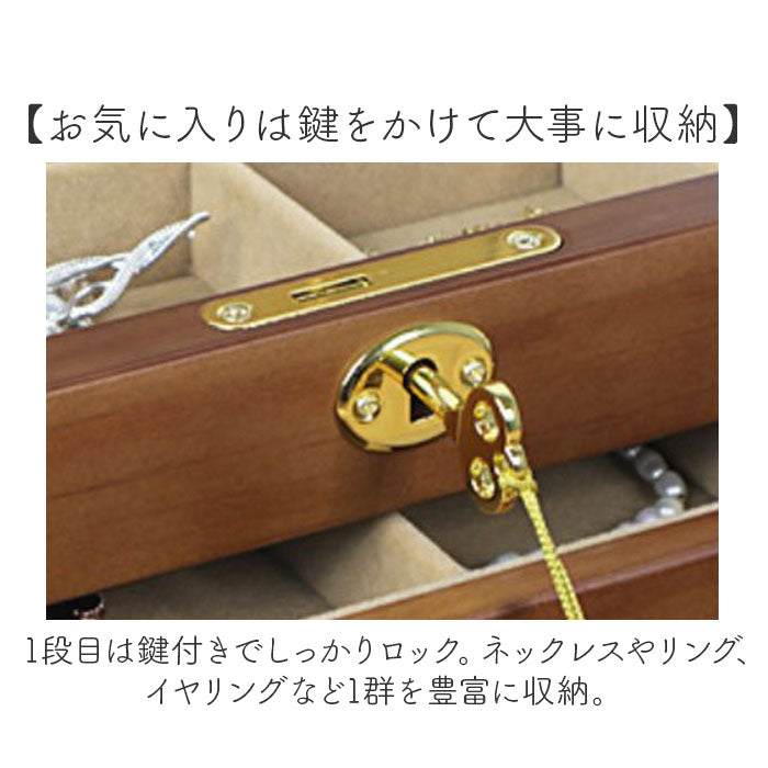 ・1段目は鍵付きでしっかりロック。ネックレスやリング、イヤリングなど1群を豊富に収納。