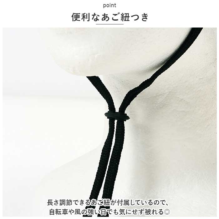 ・長さ調節できるあご紐が付属しているので、自転車や風の強い日でも気にせず被れる◎
