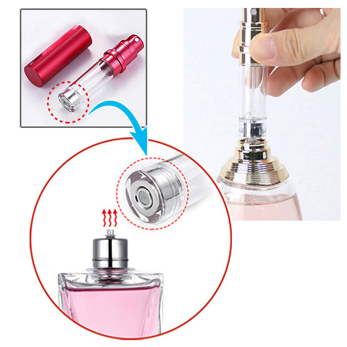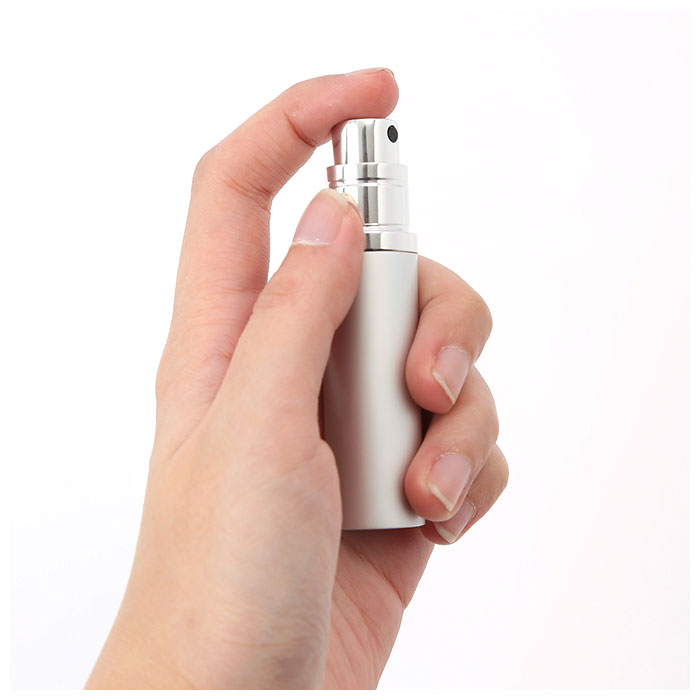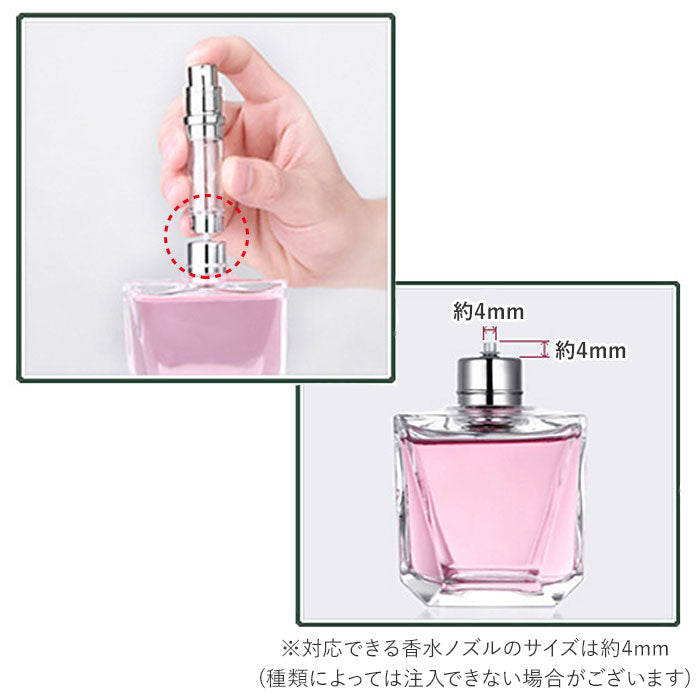 ・香水のヘッド部分を取り外した後、ヘッドのノズル部分とアトマイザーの底部にある注入口を合わせ、アトマイザーを優しく上下に押し当てることで香水を補充できる仕様。(※対応できる香水ノズルのサイズは約4mm、種類によっては注入できない場合がございます。また、アトマイザーは外側のケースを取り外して詰め替えを行ってください。)