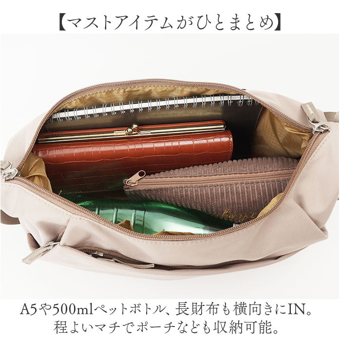 ・A5や500mlペットボトル、長財布も横向きにIN。程よいマチでポーチなども収納可能。