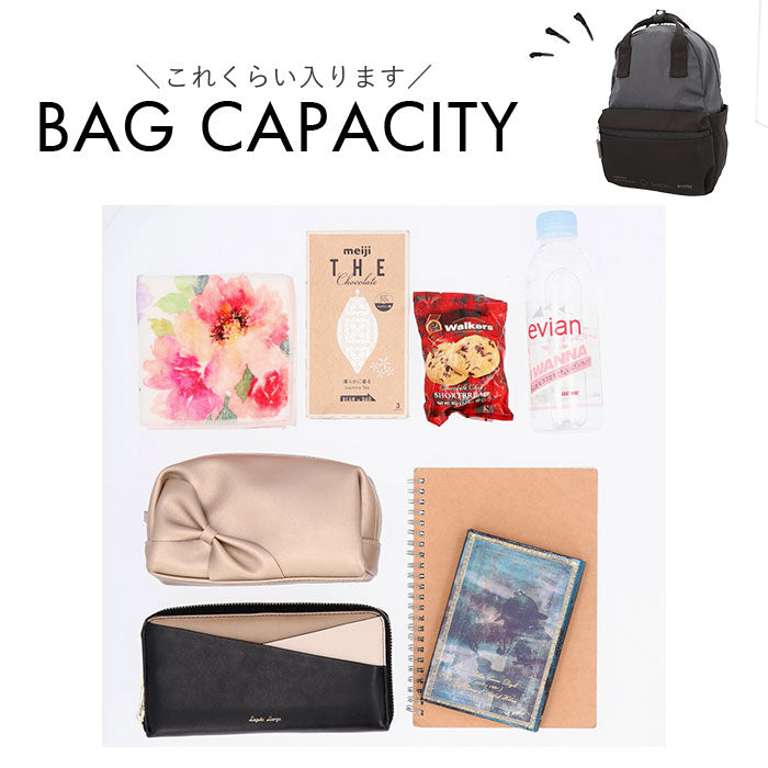 ・体に負担がかかりにくい軽量設計。可愛らしいサイズ感ながらマストアイテムがすっきりまとまり、人混みでも邪魔になりにくい♪容量は約13L。