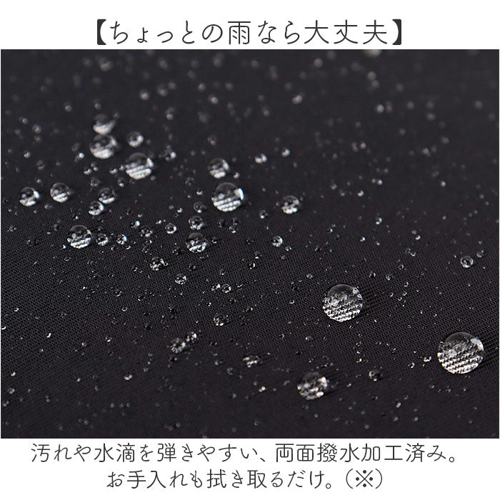 ・汚れや水滴を弾きやすい、両面撥水加工済み。お手入れも拭き取るだけ。
