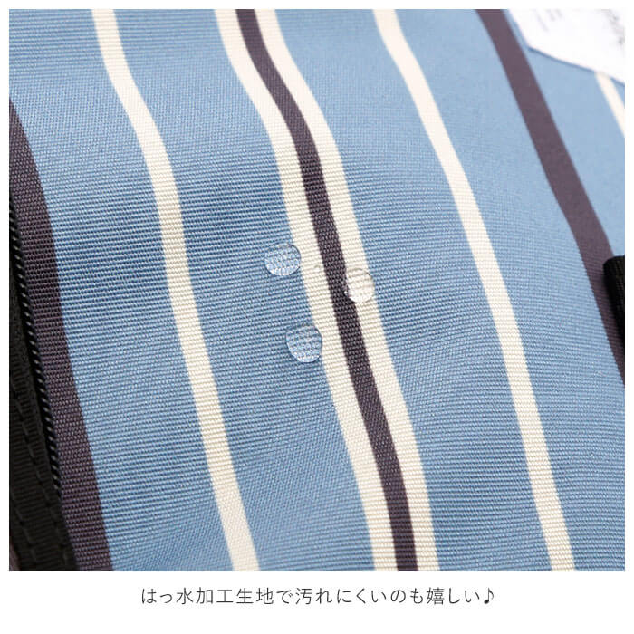 ※この製品は、はっ水加工を施した生地を使用しておりますが、防水構造ではありませんので、強い雨の中での使用などでは、製品上縫い目等の部分から浸水するおそれがありますのでご注意ください。また、経年や過度の水洗いによりはっ水加工が低下する恐れがありますので、ご注意ください。