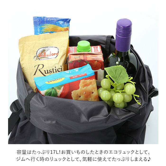 ・容量はたっぷり17L。お買い物をしたときのエコリュックとして、ジムへ行く時のリュックとして、気軽に使えてたっぷりしまえる♪