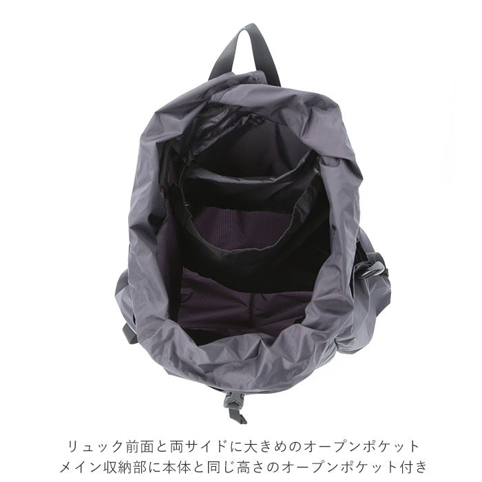 ・リュック前面と両サイドに大きめのオープンポケット、メイン収納部に本体と同じ高さのオープンポケット付き。