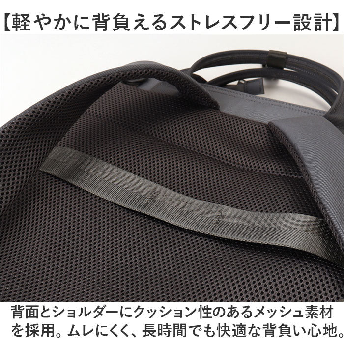 ・背面とショルダーにクッション性のあるメッシュ素材を採用。ムレにくく、長時間でも快適な背負い心地。