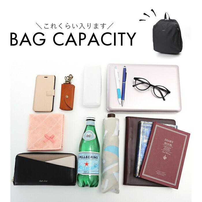 ・必要な荷物がザクザク入るデイリー使いにちょうど良いサイズ。PC、書類、ペットボトル、お弁当、折りたたみ傘、財布など、必要な物をしっかり収納◎
