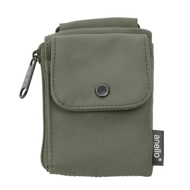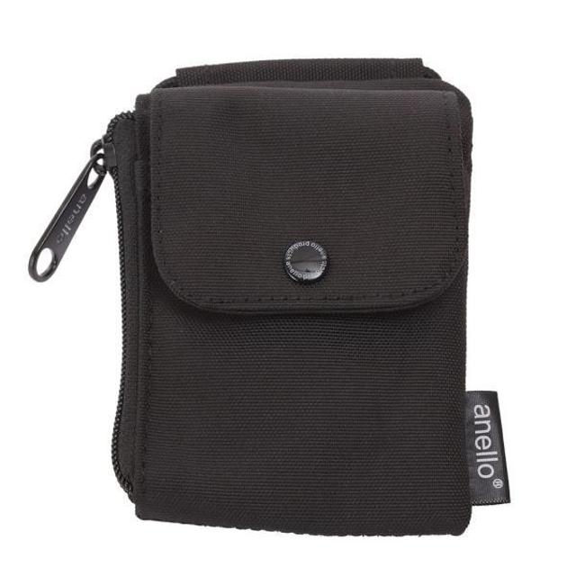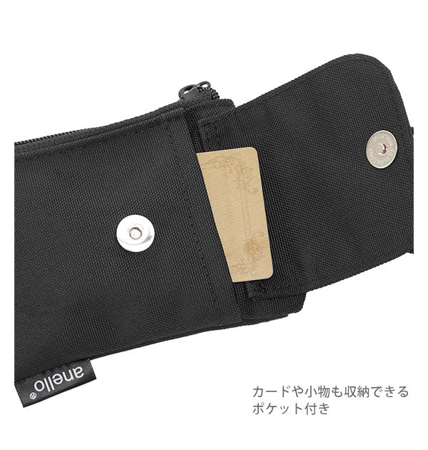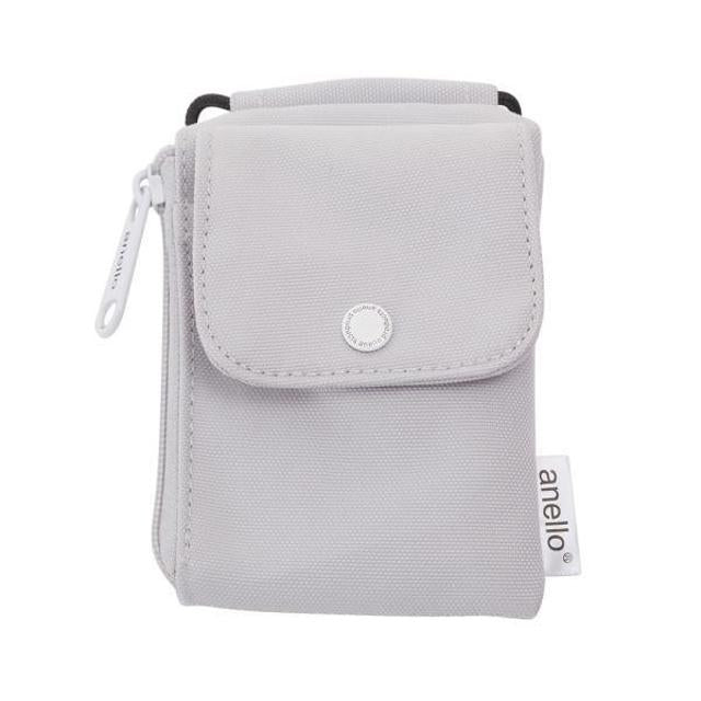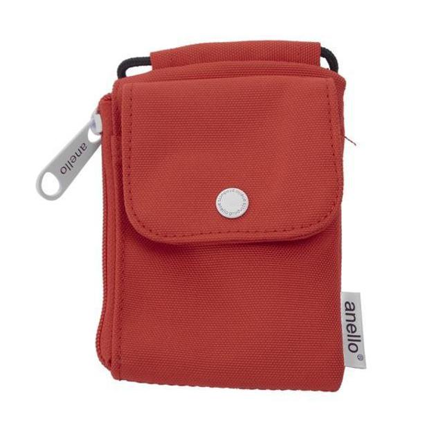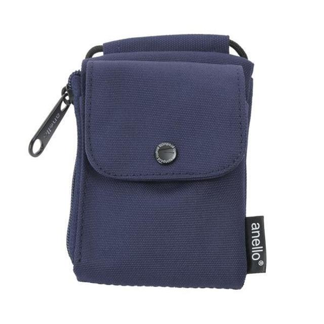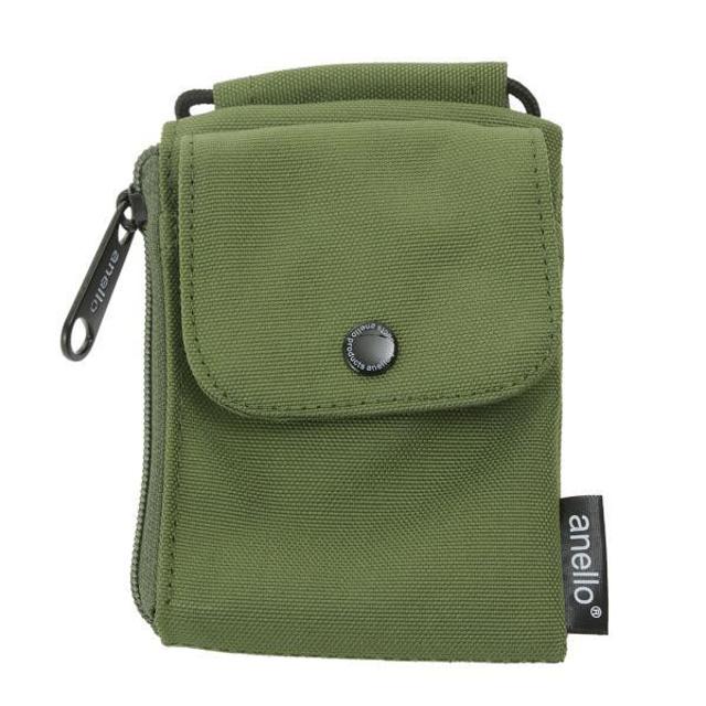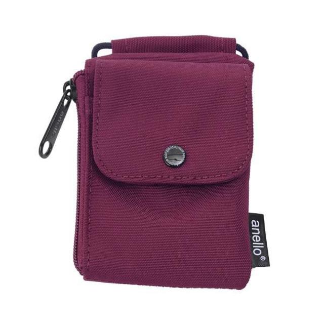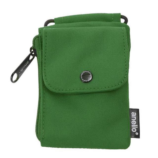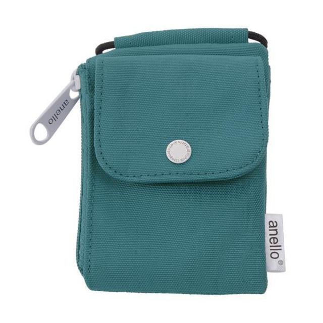 アネロのミニショルダーバッグ、ネックウォレットです。しっかりしたポリエステルの生地を使ったお財布としても使えるミニショルダーで、約13cmx約9cm程とコンパクトなサイズ。前後にはボタンのポケットがあり中央はファスナーポケットになっています。