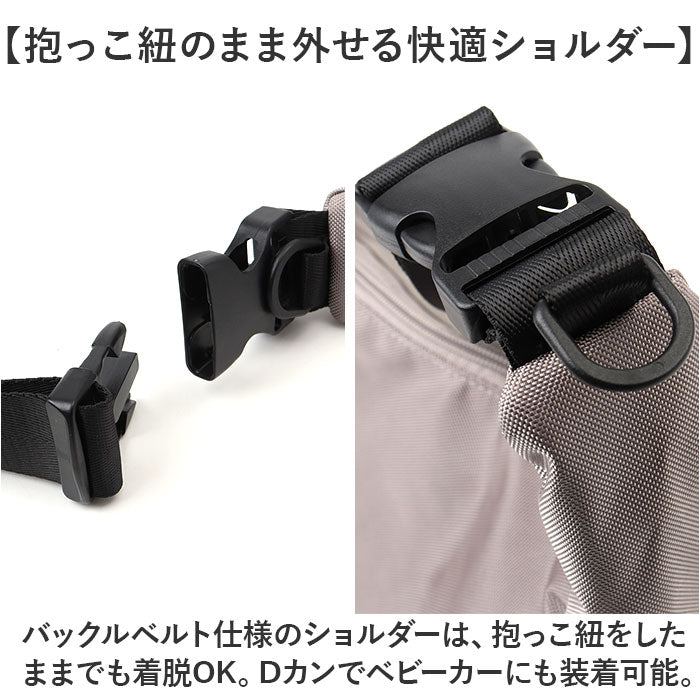 ・バックルベルト仕様のショルダーは、抱っこ紐をしたままでも着脱OK。Dカンでベビーカーにも装着可能。