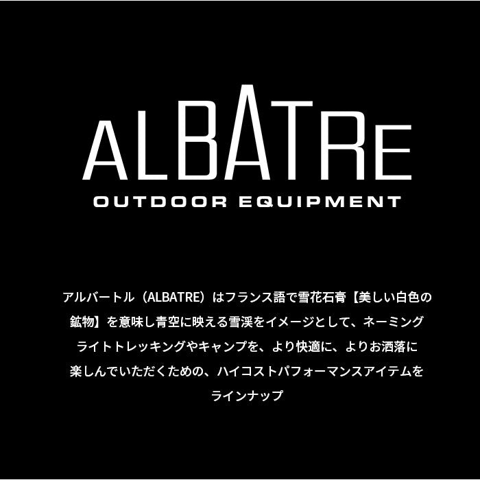 「albatre」のロゴが引き立つシンプルでおしゃれなデザイン。アウトドアや釣り、旅行や車中泊など様々なシーンでも馴染む。
