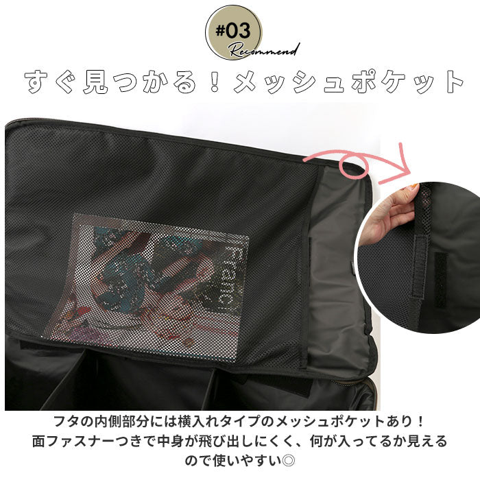 ・フタの内側部分には横入れタイプのメッシュポケットあり!面ファスナーつきで中身が飛び出しにくく、中身が見えるので使いやすい◎