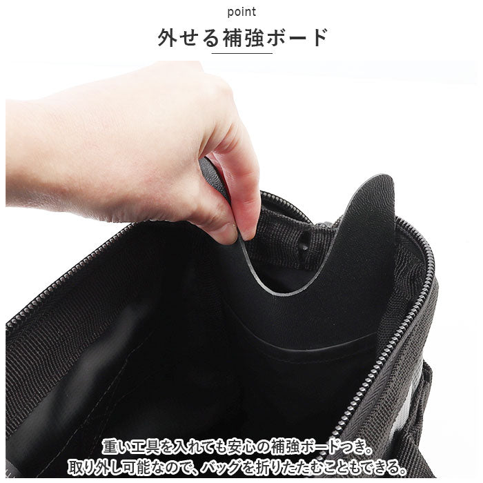 ・重い工具を入れても安心の補強ボードつき。取り外し可能なので、バッグを折りたたむこともできる。