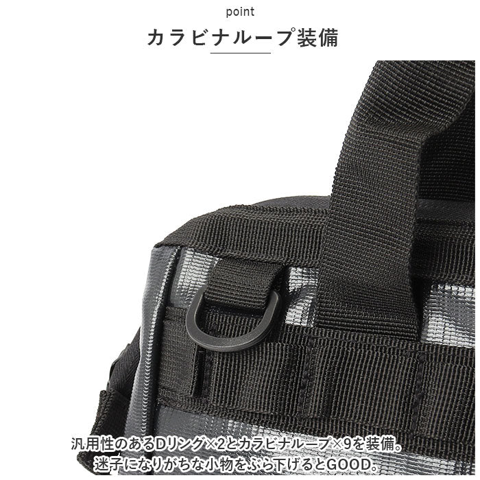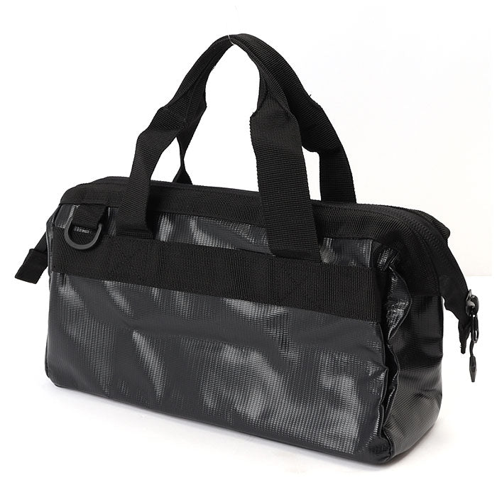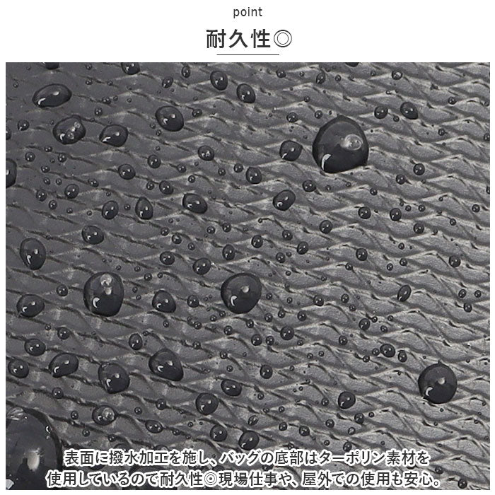・表面に撥水加工を施し、バッグの底部はターポリン素材を使用しているので耐久性◎現場仕事や、屋外での使用も安心。