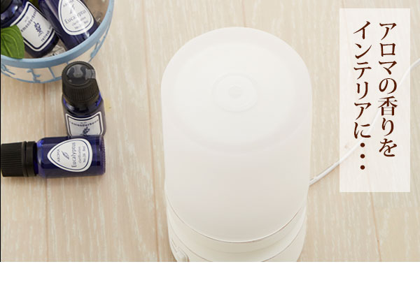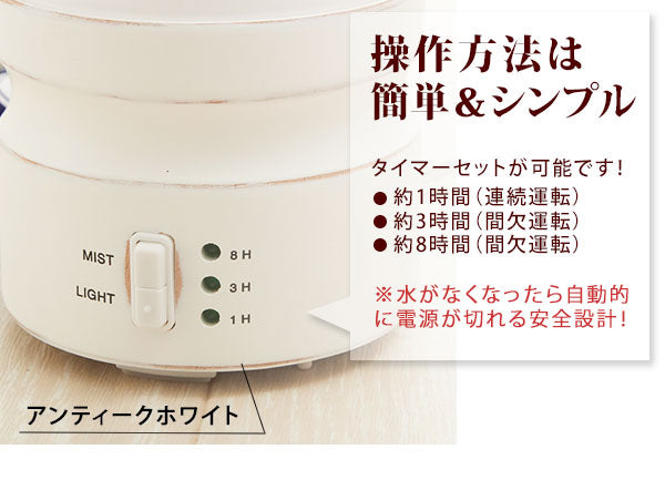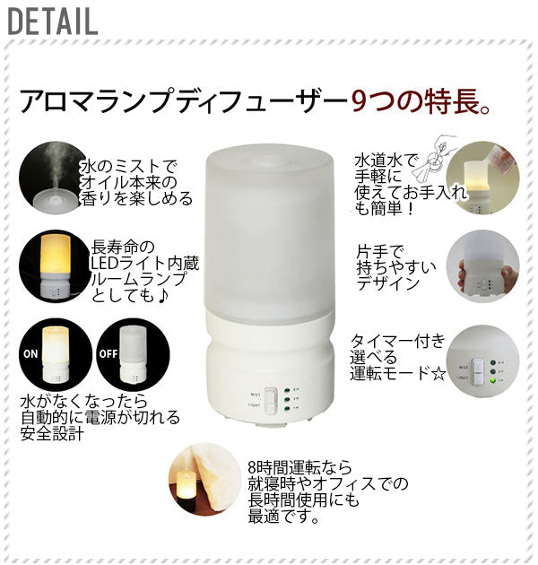 水のミストでオイル本来の香りを楽しめます。水道水で手軽に使えてお手入れも簡単です。水がなくなったら自動的に電源が切れる安全設計。タイマー付きで運転モードを選べます。8時間運転なら就寝時やオフィスでの長時間使用にも最適です。