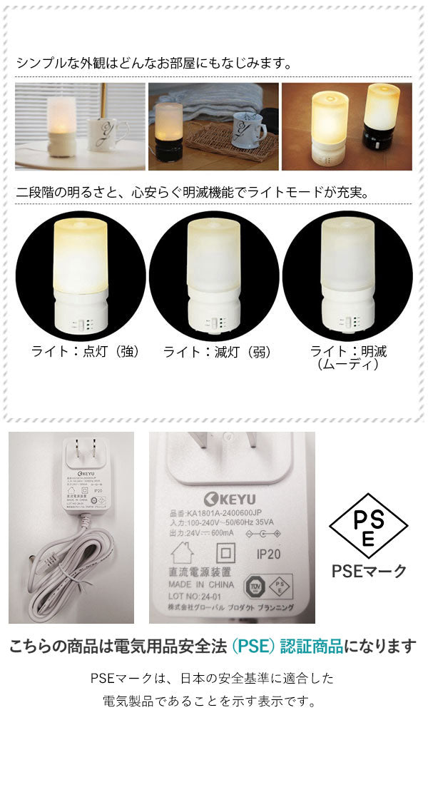 【アロマ噴射方式】超音波振動式【ミストタイマー】連続運転:1時間 間欠運転:3時間、8時間【ライトモード】強、弱、明滅(ライトがゆっくりと明滅を繰り返し蛍のような光を再現します)