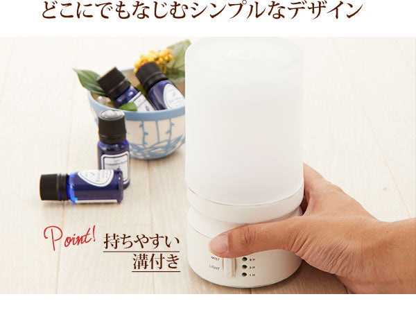 おしゃれなフロストガラスを通した柔らかいランプの灯りと、超音波で作られたきめの細かいミストが空間を包み、心を和ませてくれます。