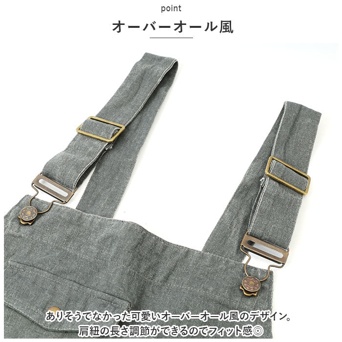 ・ありそうでなかった可愛いオーバーオール風のデザイン。肩紐の長さ調節ができるのでフィット感◎