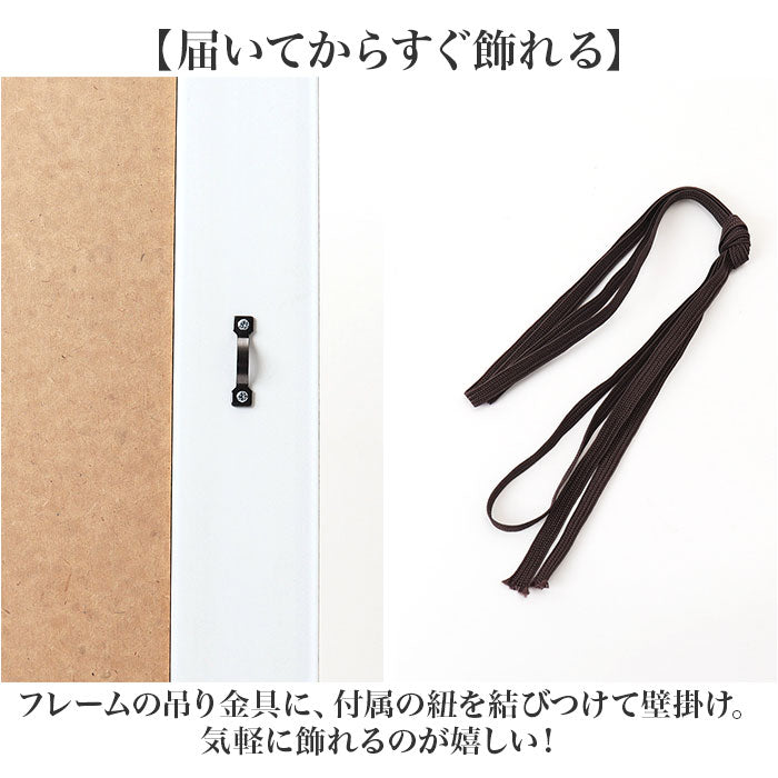 ・フレームの吊り金具に、付属の紐を結びつけて壁掛け。気軽に飾れるのが嬉しい!