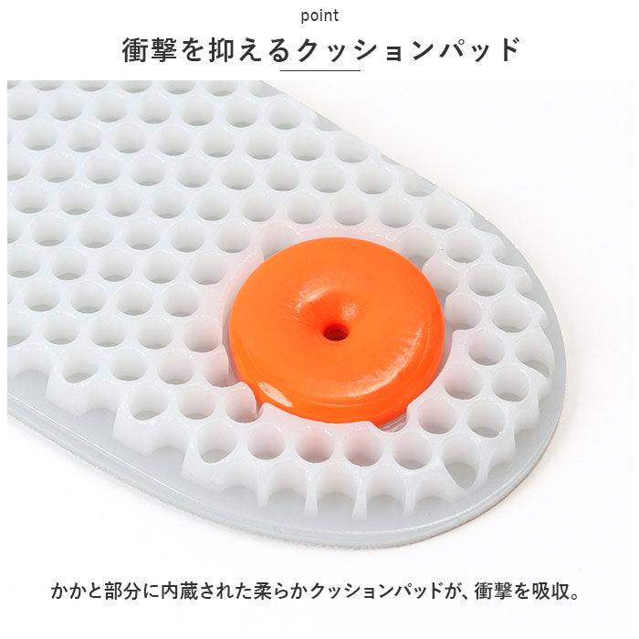 ・かかと部分に内蔵された柔らかクッションパッドが、衝撃を吸収。