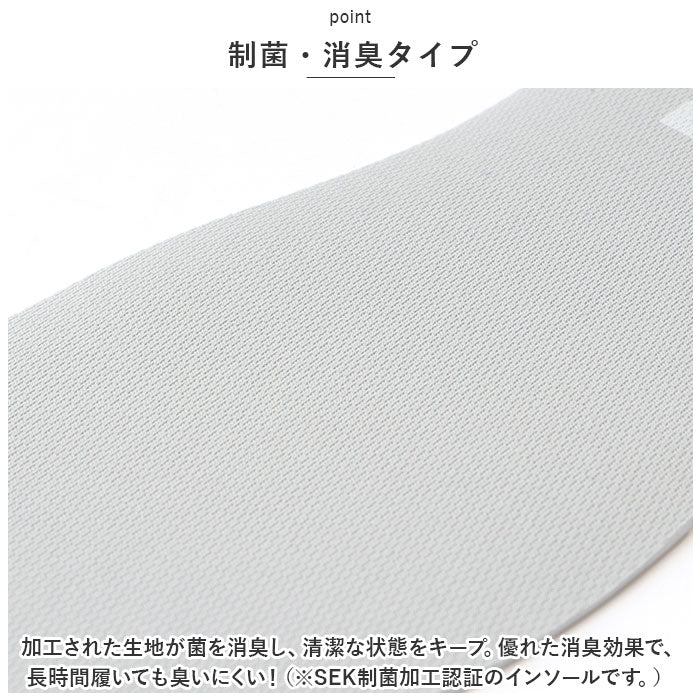 ・加工された生地が菌を消臭し、清潔な状態をキープ。優れた消臭効果で、長時間履いても臭いにくい!(※SEK制菌加工認証のインソールです。)
