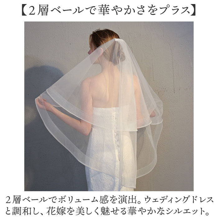 2層ベールでボリューム感を演出。ウェディングドレスと調和し、花嫁を美しく魅せる華やかなシルエット。