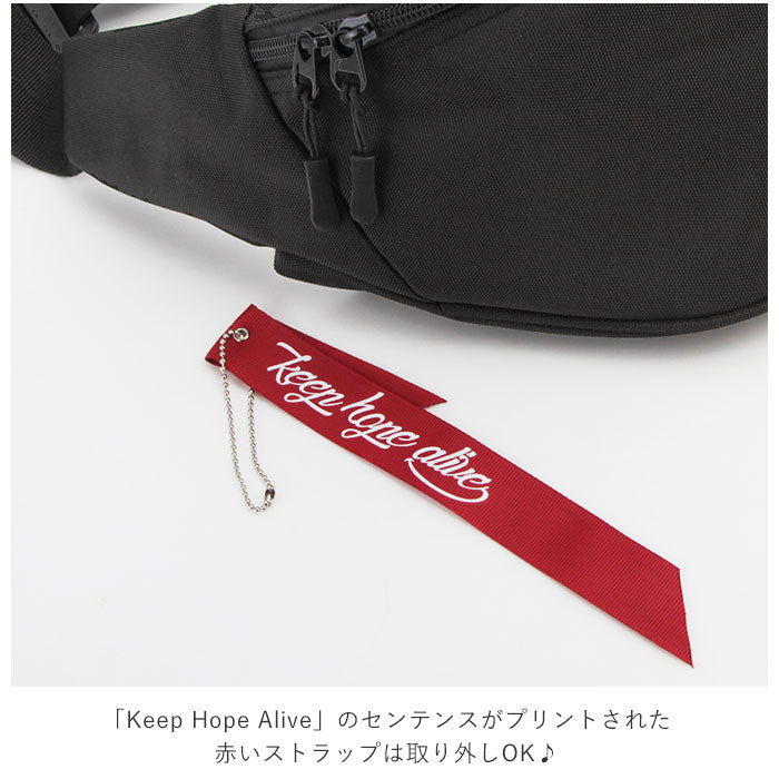 ・「Keep Hope Alive」のセンテンスがプリントされた赤いテープ生地がファスナー金具に付いて、素敵なアクセントに。身の回りの小物をサッと入れて、気軽にカフェや散歩に出かけたい時にもぴったり。