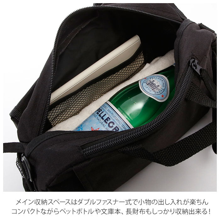 ・メイン収納スペースはダブルファスナー式で小物の出し入れが楽ちん。小ぶりなボディながら、500mlペットボトルや文庫本、長財布もしっかり収納出来る!