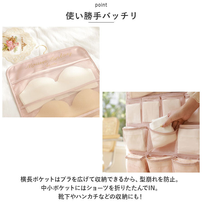 ・横長ポケットはブラを広げて収納できるから、型崩れを防止。中小ポケットにはショーツを折りたたんでIN。靴下やハンカチなどの収納にも!
