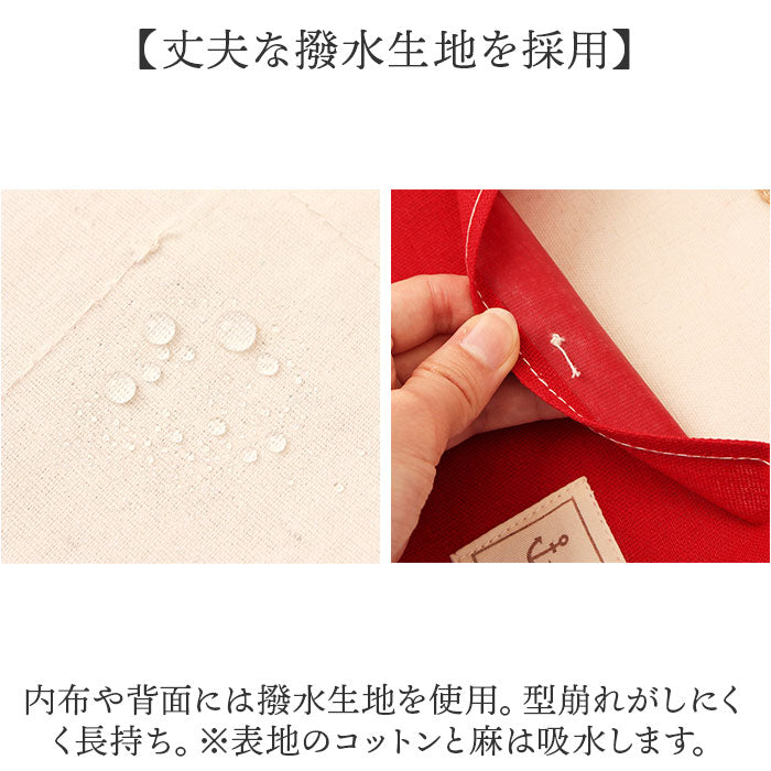 ・内布や背面には撥水生地を使用。型崩れがしにくく長持ち。※表地のコットンと麻は吸水します。