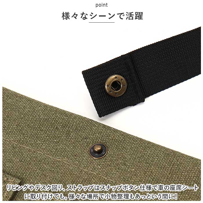 ・リビングやデスク回り、ストラップはスナップボタン仕様で車の座席シートに取り付けても。様々な場所で小物整理もあっという間に!