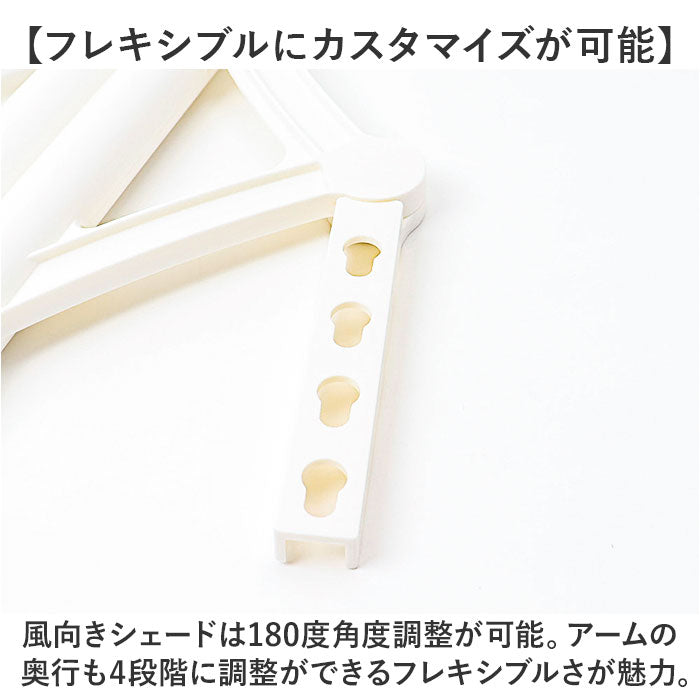 ・風向きシェードは180度角度調整が可能。アームの奥行も4段階に調整ができるフレキシブルさが魅力。