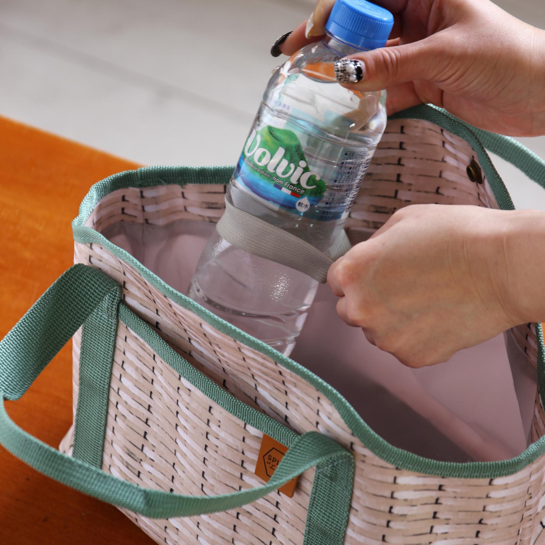 ・お弁当と500mlのペットボトルや水筒も入る大きさです。内側にペットボトルを止めるゴムも付いてる。