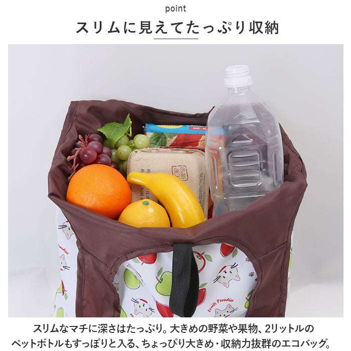・スリムなマチに深さはたっぷり。大きめの野菜や果物、2リットルのペットボトルもすっぽりと入る、ちょっぴり大きめ・収納力抜群のエコバッグ。