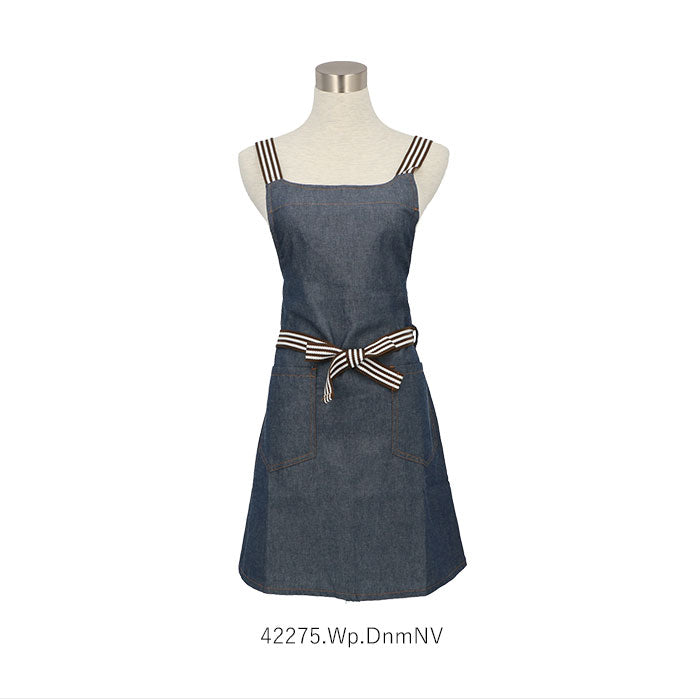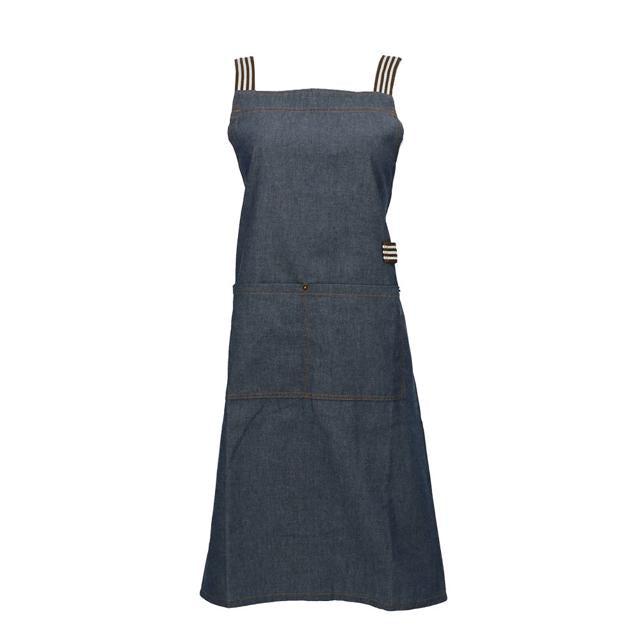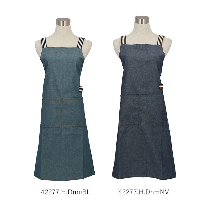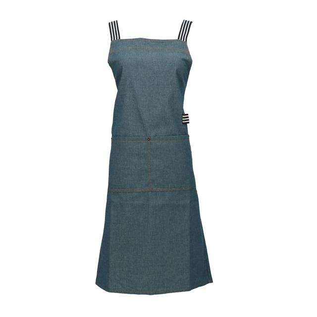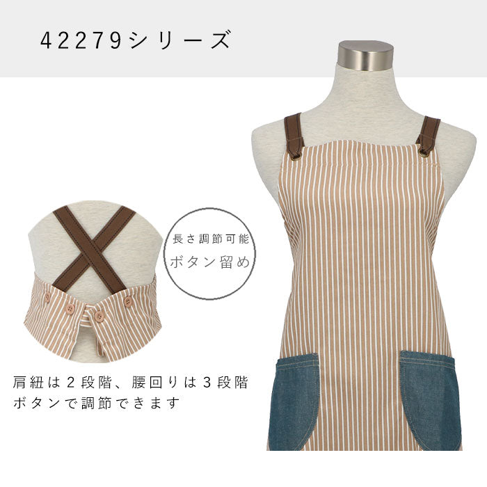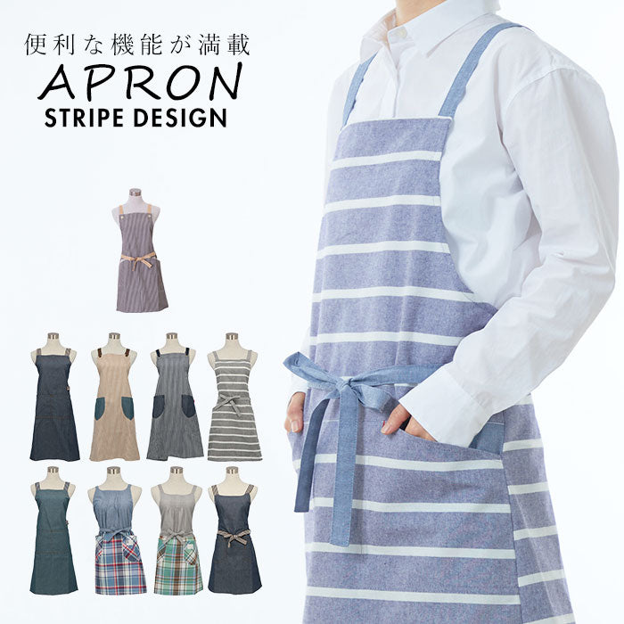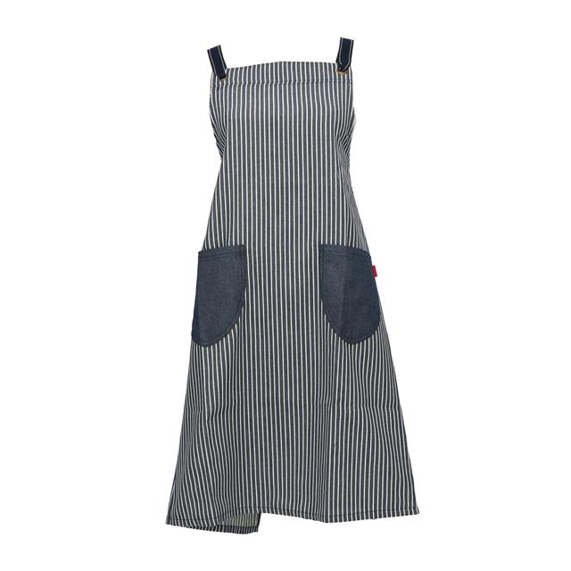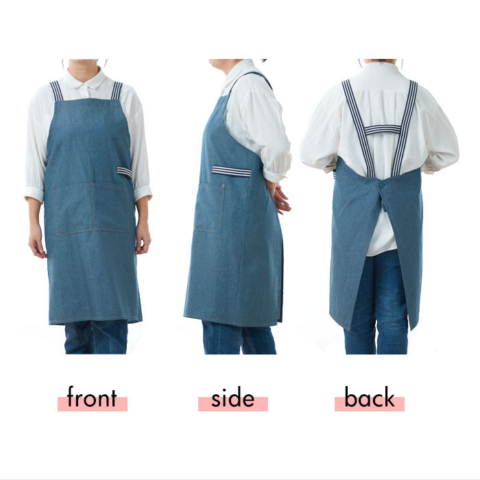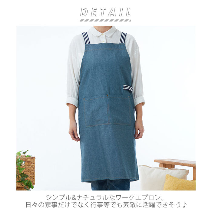 シンプルなデニム地にストライプがアクセントになった、使いやすいワークエプロンです。